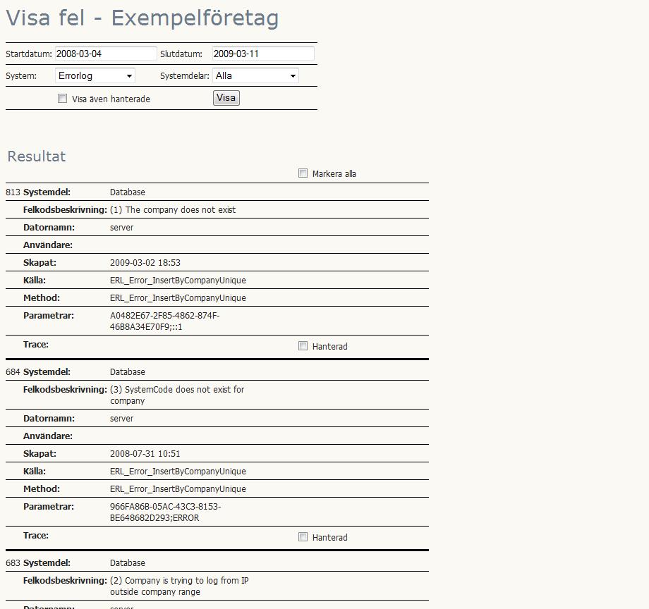 Nedan visas en bild på utsökta fel för ett givet system. Man kan markera fel som hanterade, så att de inte dyker upp i träfflistan framöver.